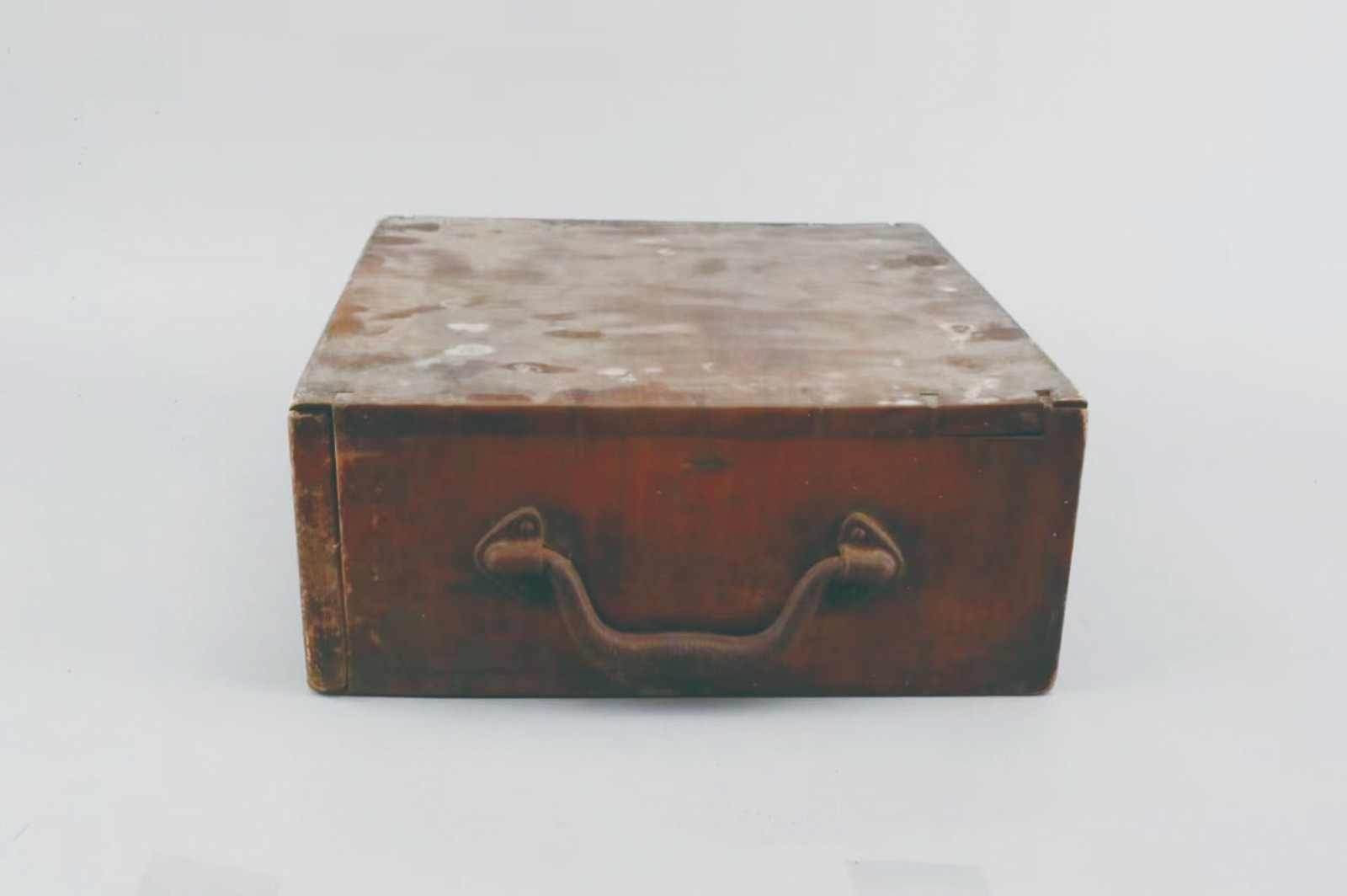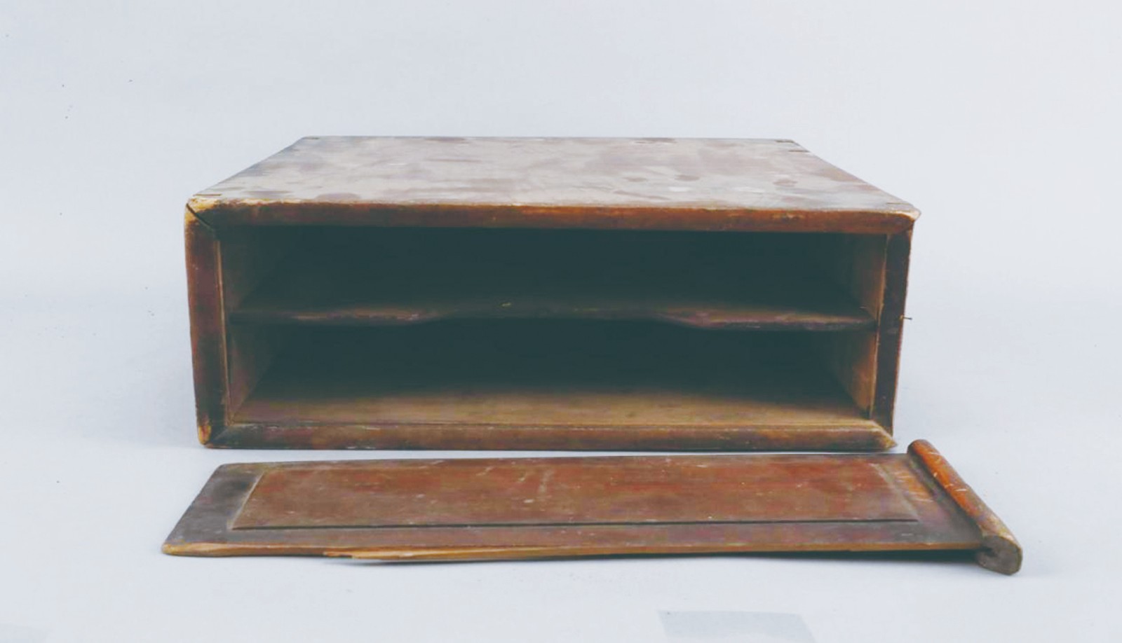 1984年,朝阳博物馆(朝阳市文物考古研究所)征集到一件革命先烈陈镜湖使用过的唱片木匣。该木匣为橡木质,呈扁长方形,长33.4厘米,宽32.6厘米,高13.5厘米。木匣一侧设有横向抽拉式挡板;匣内中部设一隔板,将内部分为上、下两层,隔板中部边缘内切为弧形,以便放、取唱片;另一侧装有一铁质“弓”形活动提梁。该木匣保存状态良好。